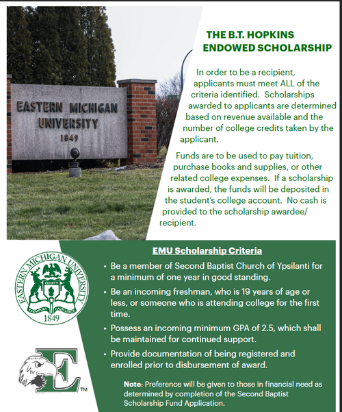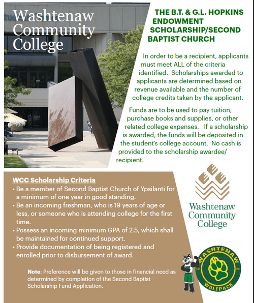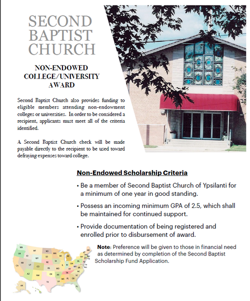 The Scholarship Ministry manages funds from contributions by church members, annual fundraisers, endowments, and public donations. Scholarships are available for eligible high school graduates, continuing college students, and those pursuing career development. Awards depend on funding availability and scholarship guidelines.