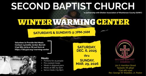 The Shelter Association of Washtenaw County and Second Baptist Church of Ypsilanti have partnered once again to open an overnight winter warming center. This center will begin operating on December 6, 2025, and will continue through March 29, 2026. The Fellowship Hall at SBCYPSI will be open every Saturday and Sunday evening from 7 PM to 7 AM, providing overnight warmth, shelter, and food for those in need.